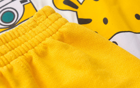 A bermuda, em tom amarelo, é feita em moletom careca 100% algodão, com recorte diferenciado e pesponto aparente que adiciona estilo ao visual. Um conjunto leve, alegre e cheio de personalidade para os dias de verão.