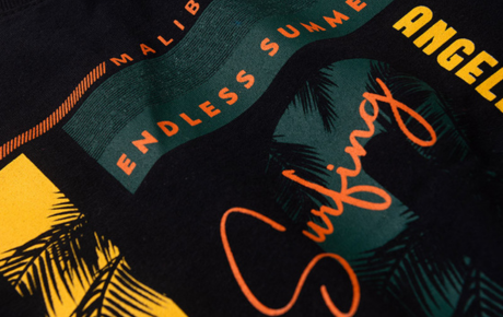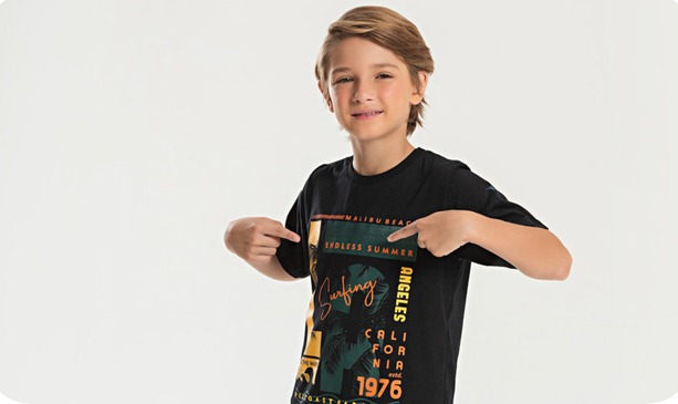 A camiseta, na cor preta, é confeccionada em meia malha 100% algodão e conta com estampa frontal inspirada no estilo praiano californiano, trazendo um toque moderno ao visual.