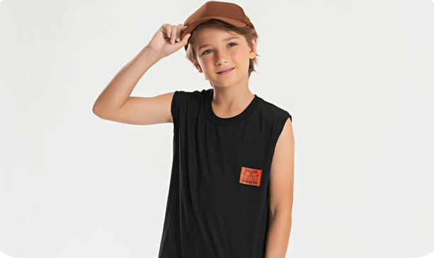 A regata preta, feita em meia malha 100% algodão, traz um aplique estiloso que adiciona um toque moderno e despojado ao visual.