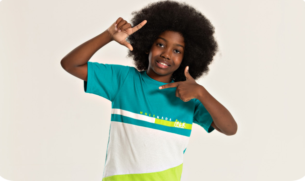 A camiseta, com recortes em tons de verde, natural e verde claro, traz versatilidade visual e um toque atual que conecta com o universo infantil de forma criativa. Feita em meia malha 100% algodão com reforço na gola, ela é macia, respirável e durável para os movimentos mais cheios de energia. Já a bermuda, também em 100% algodão e estilo moletom careca, combina frescor com praticidade, graças ao cós com elástico que facilita vestir e brincar à vontade.