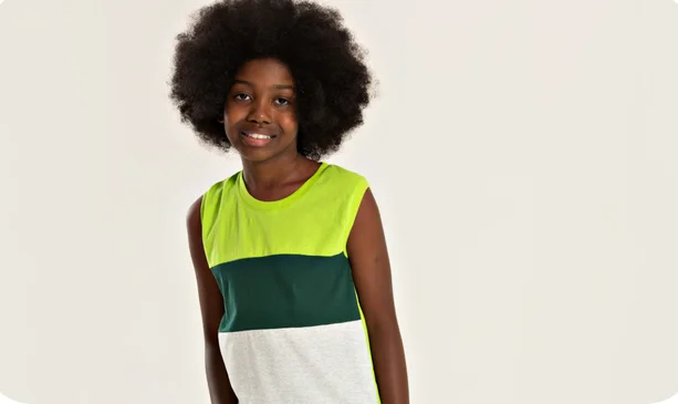 A regata possui uma combinação estilosa de recortes nas cores verde, mescla banana e verde escuro, com patch decorativo lateral que dá um toque ao look. Confeccionada em meia malha 100% algodão, com detalhe mescla banana em tecido misto (88% algodão e 12% poliéster), oferece maciez e frescor, além de reforço na gola para maior durabilidade.