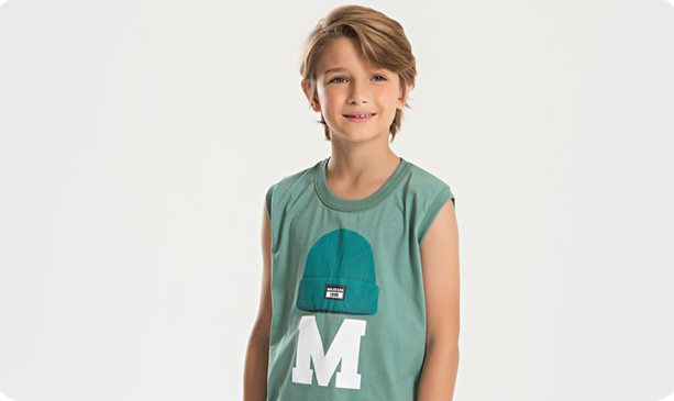 A regata, em tom de verde, é confeccionada em meia malha 100% algodão e traz uma estampa frontal moderna que garante atitude e frescor nos dias quentes.