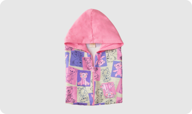 Confeccionada em moletom 100% poliéster, ela traz uma estampa sublimada encantadora de ursinhos na cor rosa, garantindo um visual delicado e aconchegante. O fechamento em zíper facilita o vestir, enquanto o capuz proporciona proteção extra contra o frio. Os punhos e a barra em ribana garantem um ajuste perfeito, tornando essa jaqueta ideal para os dias gelados com muito conforto e charme!