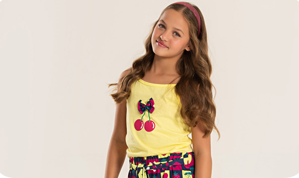 A parte superior, na cor amarelo, é confeccionada em meia malha 100% algodão, com alcinhas e estampa frontal charmosa com laço aplicado, oferecendo leveza e delicadeza ao visual. O shorts, na cor marinho, é confeccionado em poliplex sublimado 100% poliéster, com estampa sublimada e nó para amarração na cintura, que adiciona um toque moderno e divertido. Um look fresquinho e encantador para as pequenas aproveitarem o verão com muito estilo.