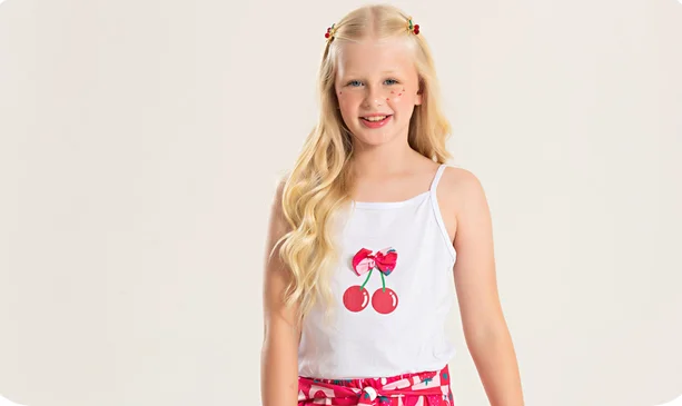 A parte superior, na cor branca, é confeccionada em meia malha 100% algodão, com alcinhas e estampa frontal charmosa com laço aplicado, oferecendo leveza e delicadeza ao visual. O shorts, na cor cereja, é confeccionado em poliplex sublimado 100% poliéster, com estampa sublimada e nó para amarração na cintura, que adiciona um toque moderno e divertido. Um look fresquinho e encantador para as pequenas aproveitarem o verão com muito estilo.