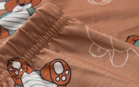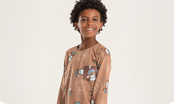 A calça, também em malha fiada 100% poliéster, complementa o conjunto com leveza e liberdade de movimento. Na cor marrom, possui estampa sublimada, criando um visual harmonioso e cheio de personalidade. O cós com elástico garante um ajuste perfeito ao corpo, permitindo que os pequenos durmam e brinquem com total conforto.
