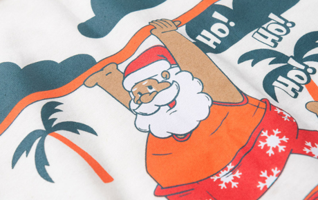A camiseta em tom natural, confeccionada em meia malha 100% algodão, traz uma estampa frontal alegre e tropical, com um Papai Noel pronto para pegar ondas.
