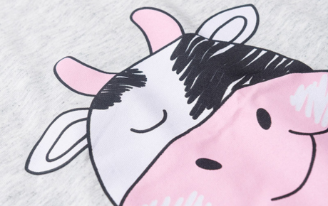 A blusa, na cor mescla, é confeccionada em meia malha macia (88% algodão e 12% poliéster), com uma estampa frontal de vaquinha super divertida.