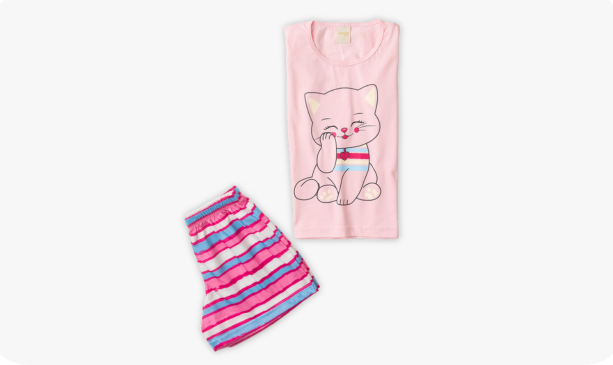 Transforme a hora do sono em um momento divertido e confortável com o Pijama Verão Menina Blusa e Shorts Gatinha Listrada!