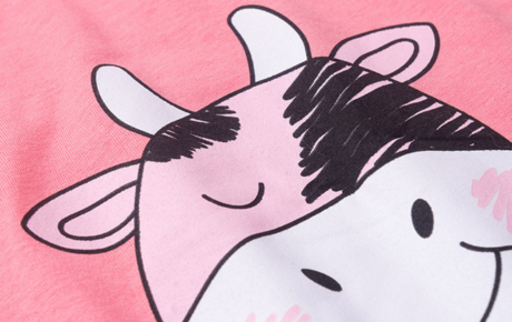 A blusa, na cor rosa forte, é confeccionada em meia malha macia 100% algodão, com uma estampa frontal de vaquinha super divertida.