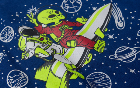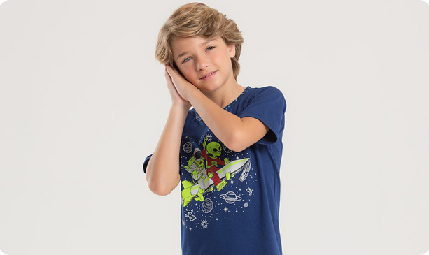 A camiseta marinho, confeccionada em meia malha 100% algodão, conta com estampa frontal que brilha no escuro, despertando a curiosidade dos pequenos astronautas. A gola sublimada traz um toque especial ao visual.