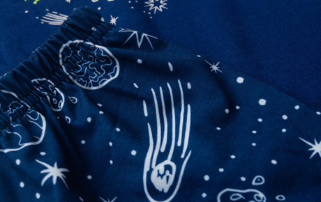 A bermuda, também em marinho, é feita em malha fiada 100% poliéster, com estampa espacial sublimada e cós com elástico que garante conforto durante toda a noite. Um conjunto fresquinho, divertido e ideal para quem ama sonhar alto!