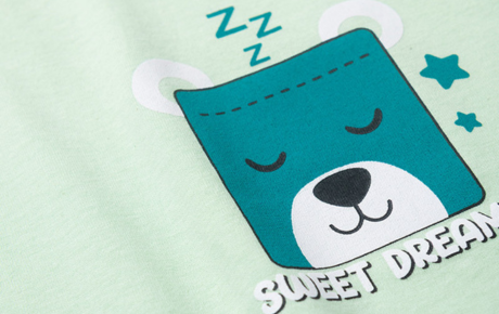 A bermuda, também em verde, é feita em malha fiada 100% poliéster com estampa sublimada e cós com elástico, oferecendo leveza e liberdade para dormir e brincar com conforto. Um conjunto perfeito para noites de muita ternura e estilo!