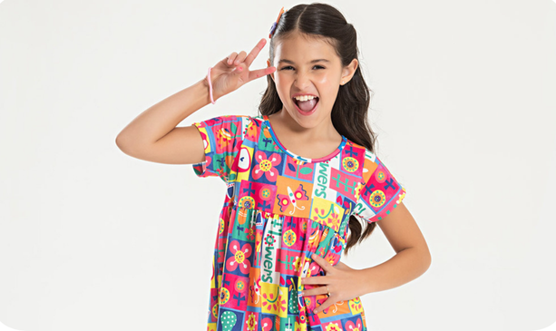 Na cor azul, o modelo é confeccionado em poliplex com 96% poliéster e 4% elastano, garantindo leveza, elasticidade e um caimento confortável para os dias quentes. A estampa sublimada traz um alegre jardim colorido, deixando o look das pequenas ainda mais encantador e cheio de vida. Ideal para momentos de lazer e diversão com muito estilo.
